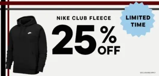 Limited time! Shop in store and get 25% off Nike Club fleece.
