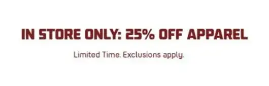 Shop in store today and get 25% off apparel for a limited time.