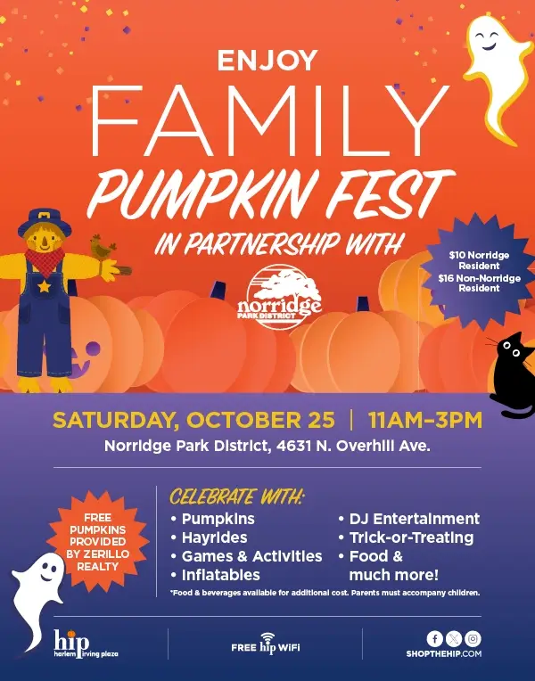 In partnership with Norridge Park District, celebrate Halloween at Norridge Park District and enjoy Pumpkins, Hayrides, Games & Activities, Inflatables, DJ Entertainment, Trick-or-Treating, Food and more!